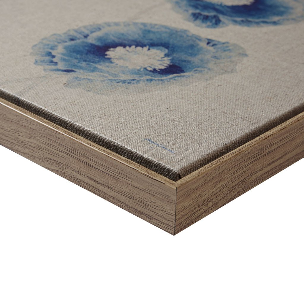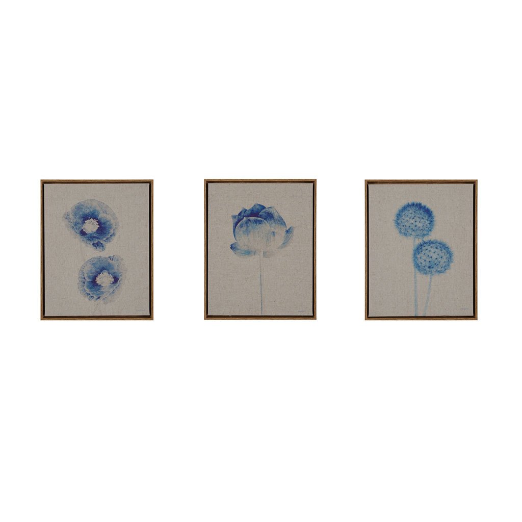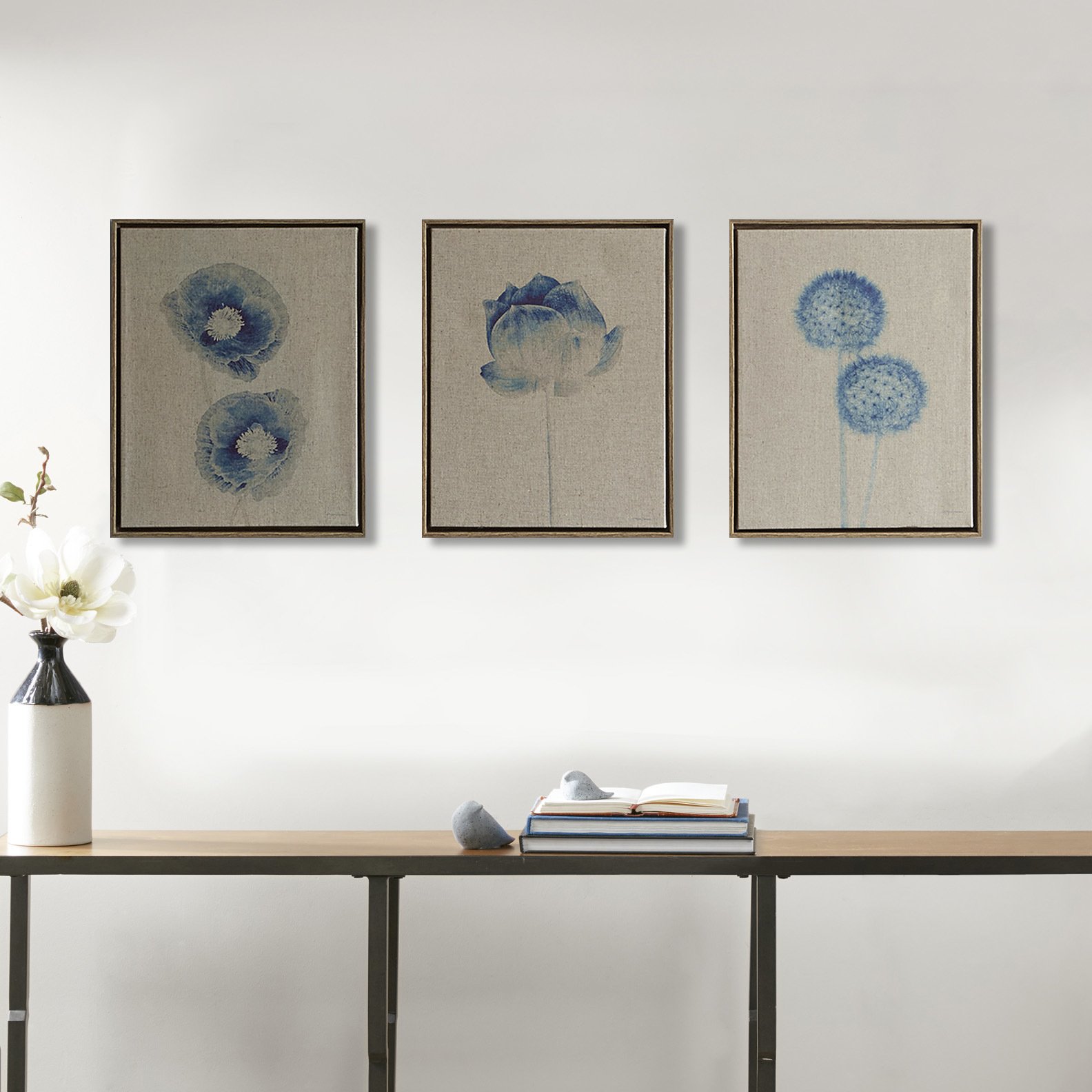 The Madison Park Blue Print Botanicals by artist Morgan Yamada, brings a soft and feminine touch to your home. This wall art set features unique floral prints in vivid blue hues on a linen canvas for a soft and vintage look, while the wood tone frame adds a natural touch complementing the canvas wall art. A saw tooth fixtures on the reverse of each piece makes them easy to hang and arrange on your wall to fit any space. Simply display this set together either lined up or staggered, or hang pieces separately throughout your home for a more stylized approach. Comes as a 3 piece set, each canvas piece measures 11x14" and is spot clean only.